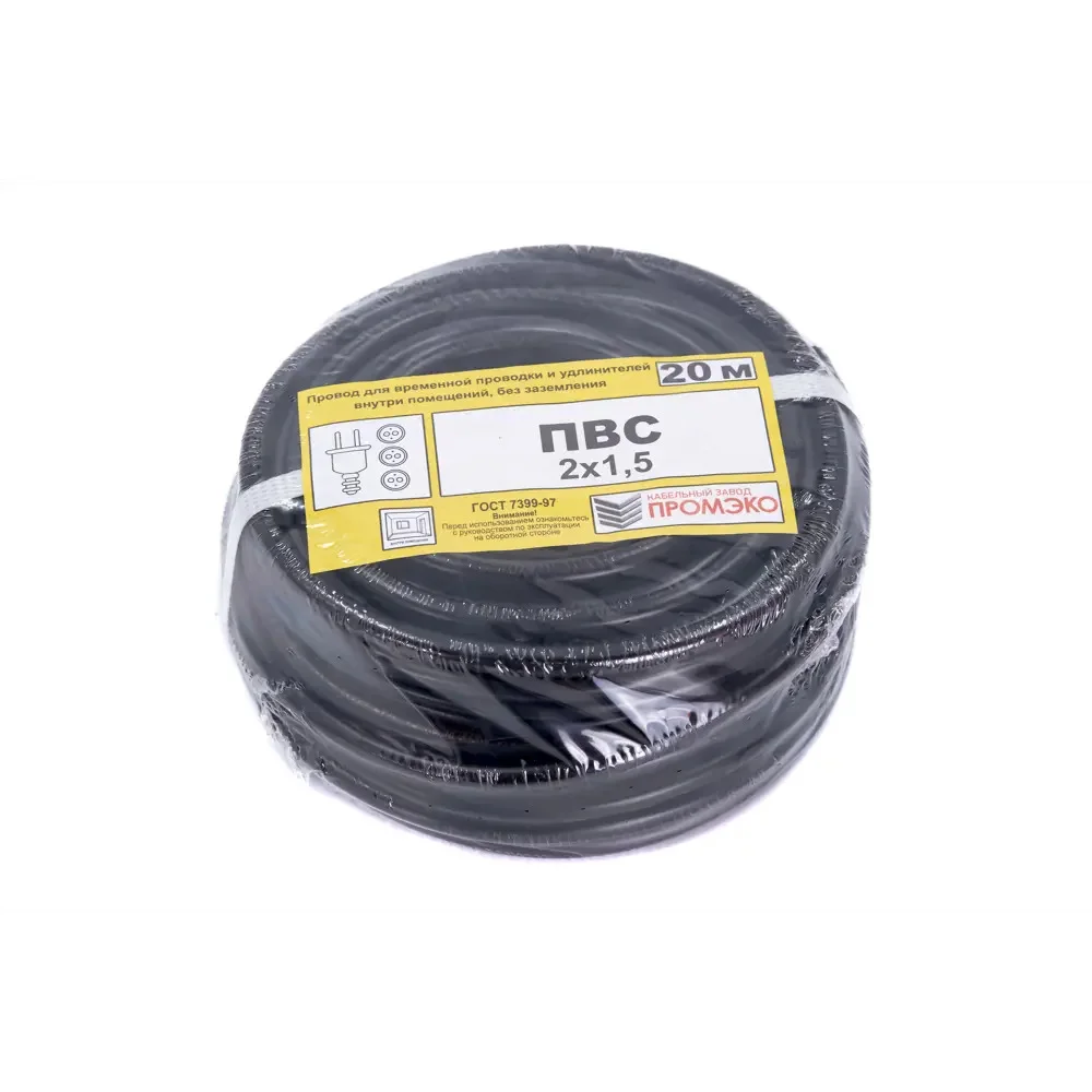 Провод Промэко ПВС сделан в соответствии с ГОСТ 7399-97. Эксплуатируется в температурном диапазоне от -15°C до 40°C. Подходит для подключения бытовых приборов — вентилятора, холодильника, изготовления удлинителей. Цвет изоляции — черный.