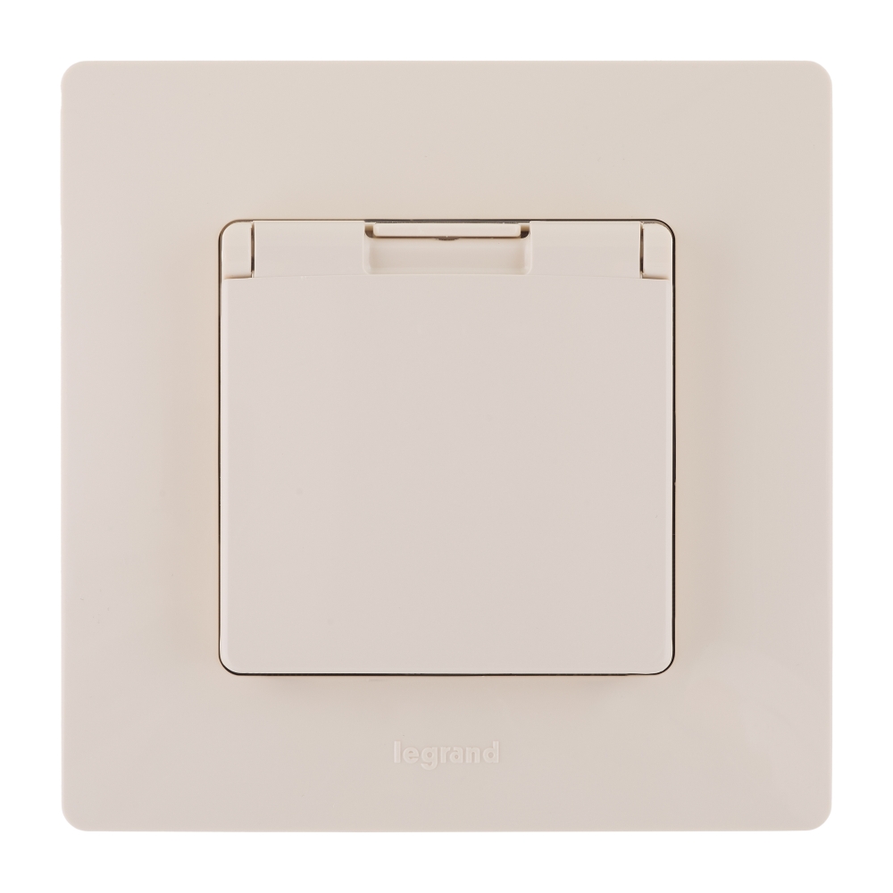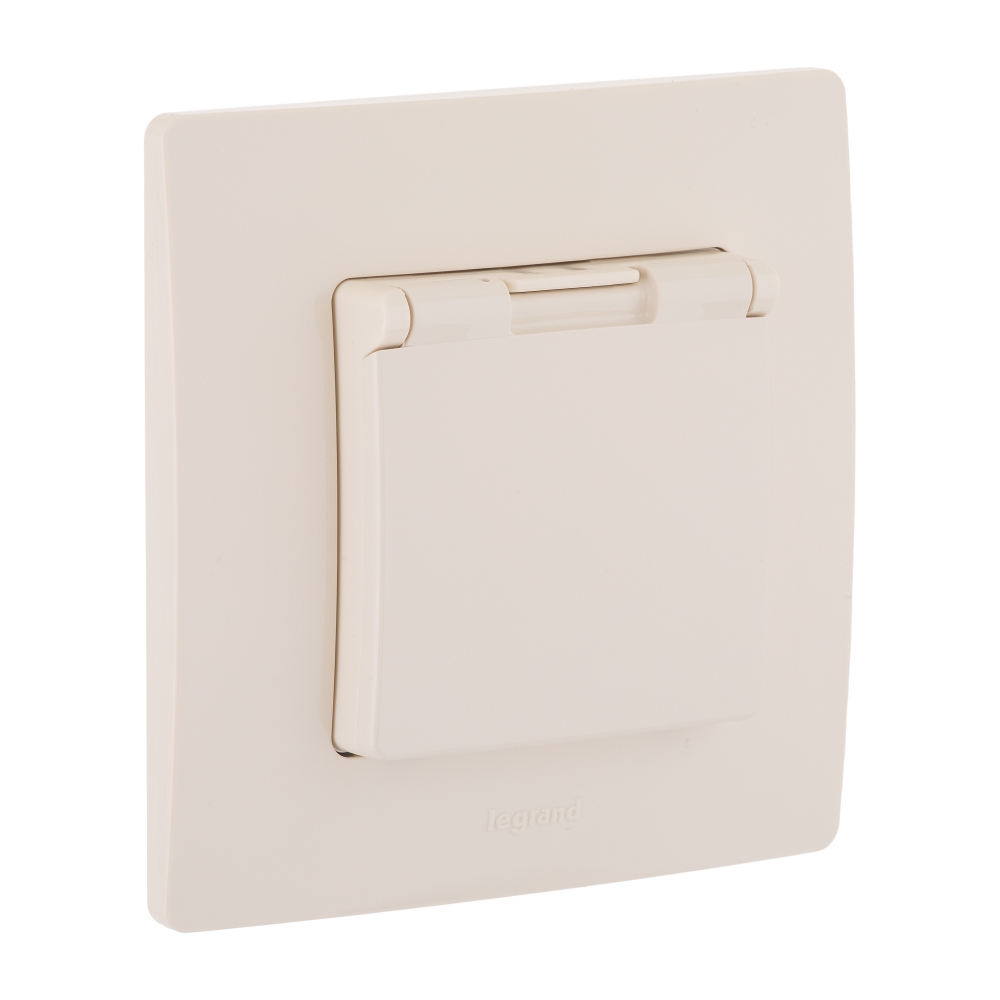 Розетка с заземлением, защитной крышкой и интегрированными защитными шторками Legrand Etika для скрытого монтажа, цвет"Слоновая кость",степень пылевлагозащиты IP44, номинальный ток 16А, напряжение ~250В, максимальная мощность 3680Вт.